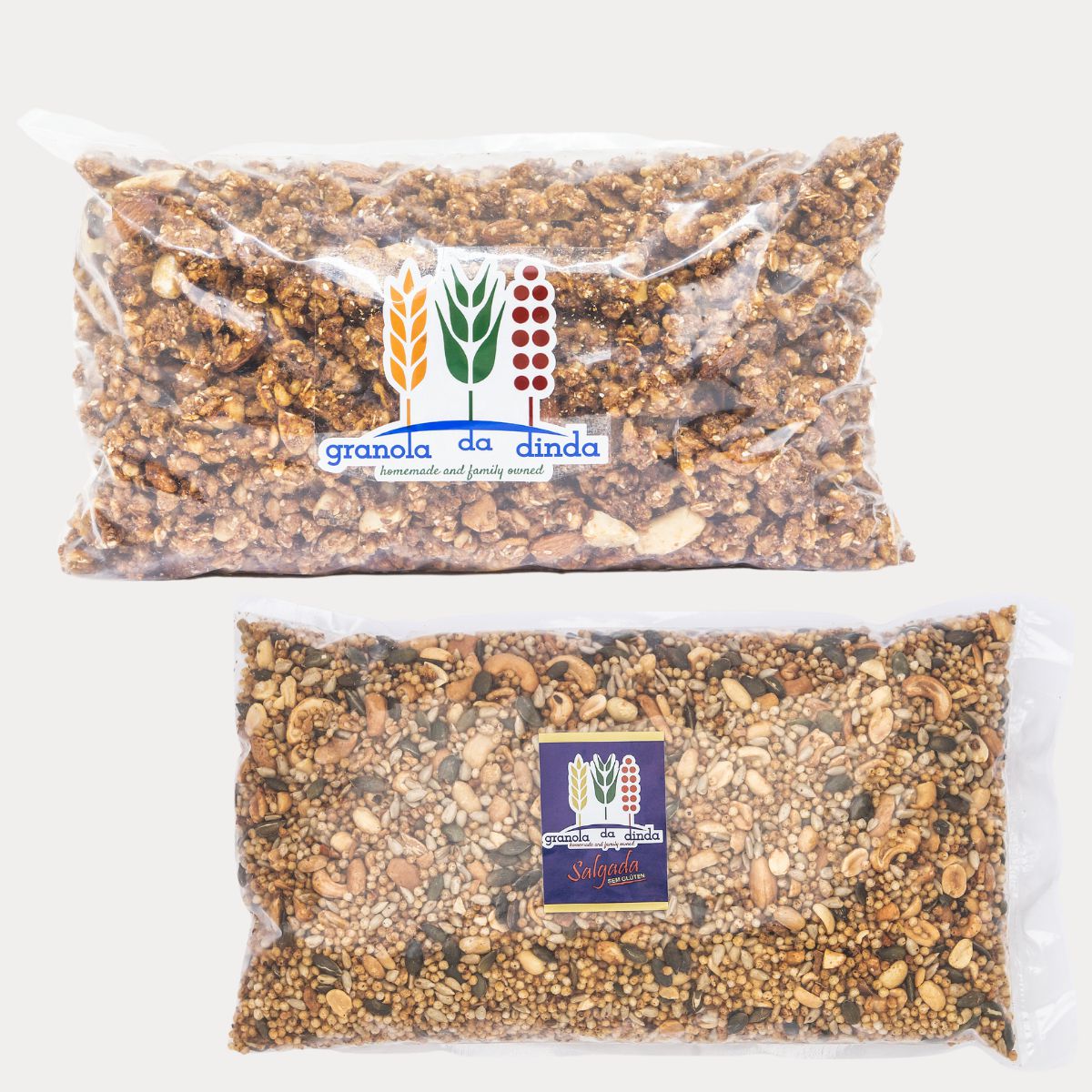 Kit com 1 refil de 1kg de Granola da Dinda Tradicional + 1 refil de 1kg de Granola da Dinda Salgada.